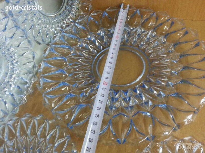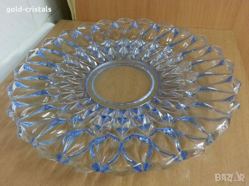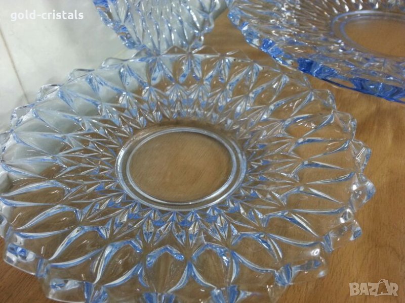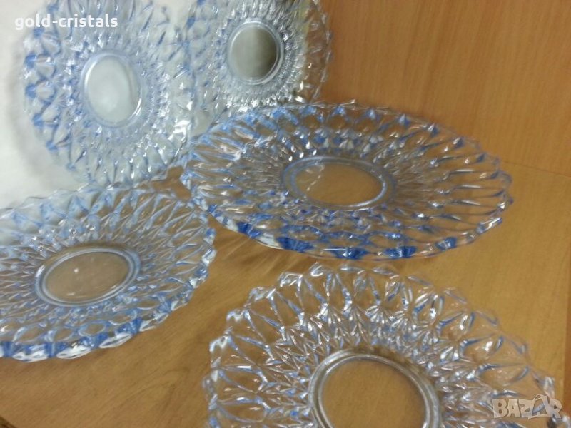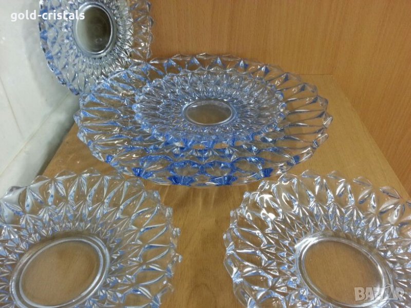 кристален сервиз цветно синьо стъкло голяма чиния плато и 4бр чинии масивни и тежки красиви сервиз комплект сет лот стар старинен антикварен арт декор винтидж колекция стари антикварни предмети обзавеждане за дома и семейството подходящи за подарък за ценители и колекционери