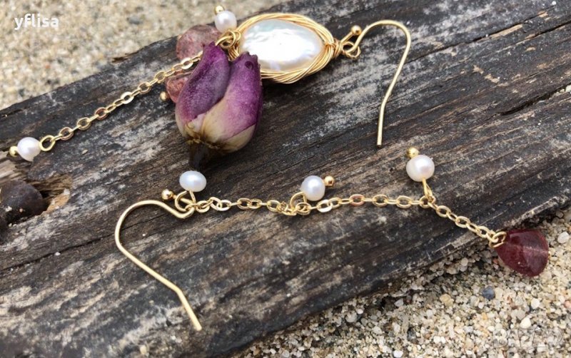 Фешън обици с естествени перли, седеф и истинска роза