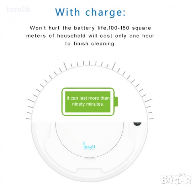 • 1200mAh литиева батерия, с продължителност около 100 минути, подходяща за 150 квадратни метра
