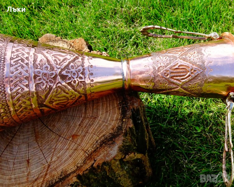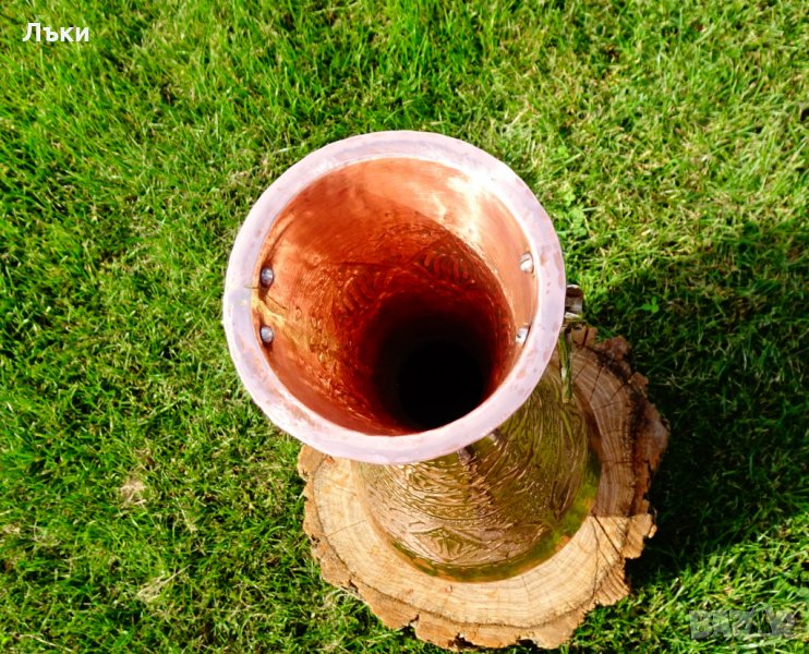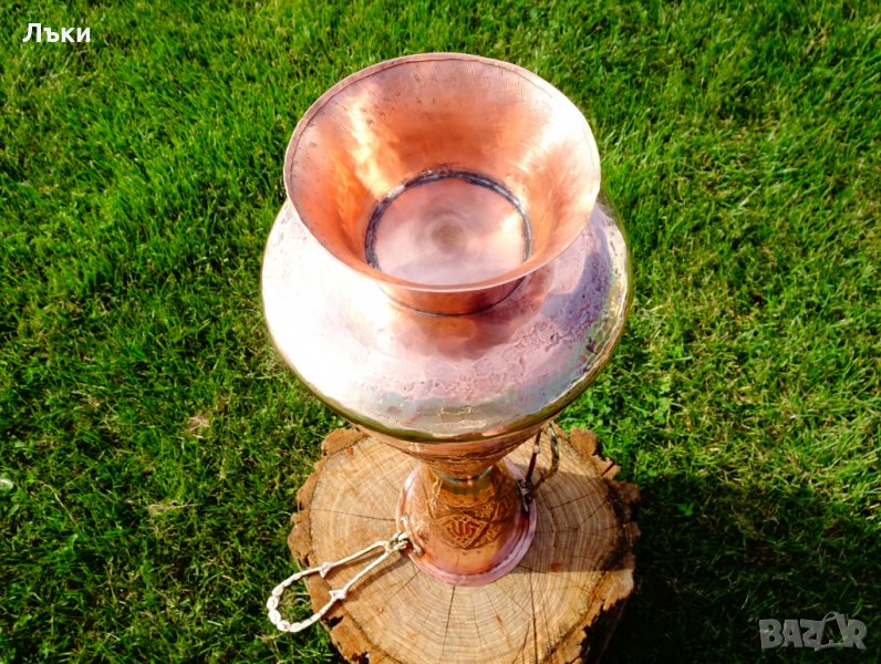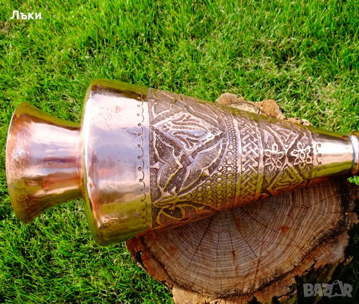 Старинна персийска медна кана,ваза,изключителен представител на древното изкуство възникнало преди 3000 години в столицата на Персия Isfahan, наречено Qalamzani или Ghalam zani.Кове се и се гравира със специално предназначени инструменти, които надхвърлят 120 вида.Вазата има релефно отляти бронзови дръжки.Вътре не е калайдисана.Височина 53 см.,диаметър 19