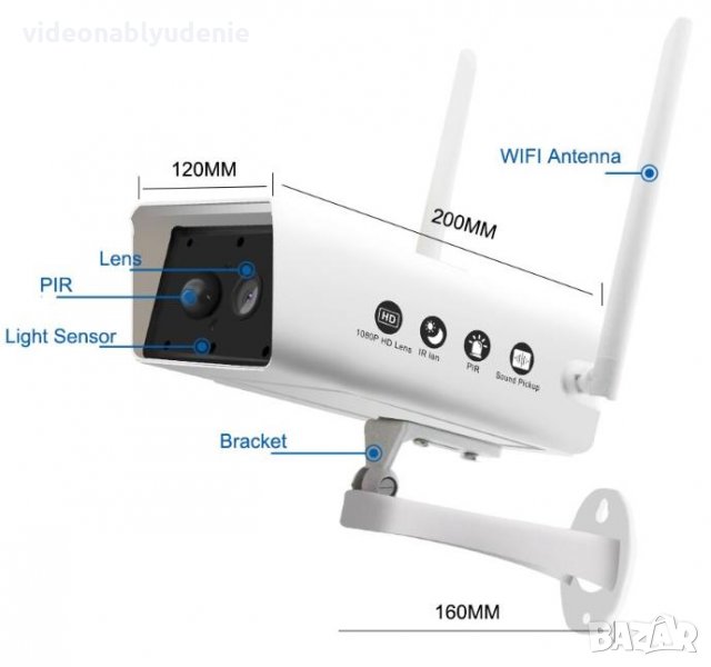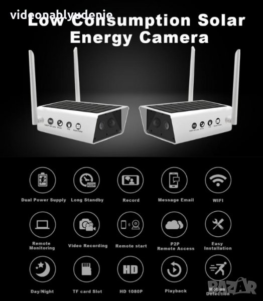 Безжична камера за външен монтаж с 2 MPх CMOS сензор, висока FULL HD резолюция 1080P и фиксиран 3.6мм обектив. С вградения PIR сензор за движение с широкоъгълен IR обхват, IP67 влагозащитен дизайн за работа в различни метеорологични условия и захранване от соларен панел, охранителната камера е идеалния „