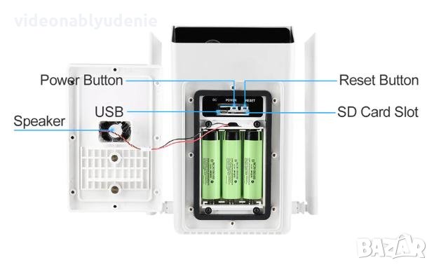 Автономната работа на камерата се подсигурява от 3 презареждаеми батерии и соларен панел. Отделно може да се зарежда и от мини USB слота.