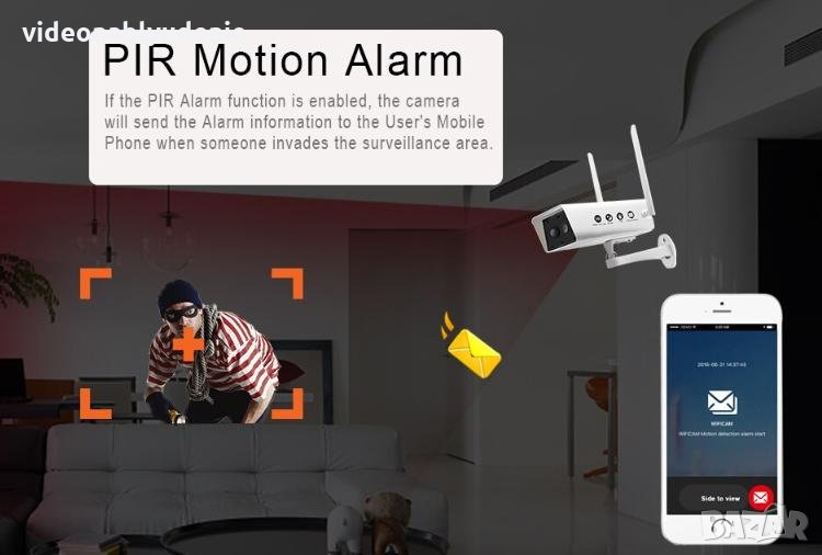 Чрез вградения детектор за движение, соларната камера предупреждава за всяко регистрирано движение в работния обсег и подава известие към мобилният ви телефона или електронна поща.