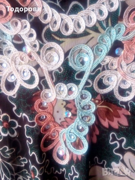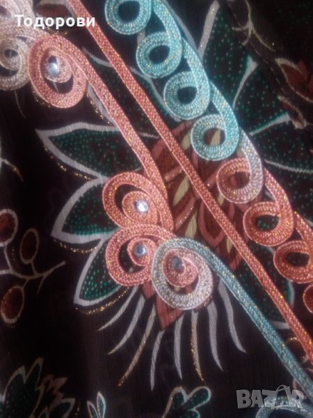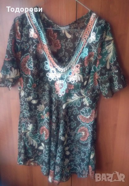 Продавам почти нова, без забележки, красива дълга блуза, индийски тип. Размери: гръдна обиколка- 120 см, подгръдна обиколка 110 см, дължина на ръкава- 30 см, дължина на блузата- 80 см. Има набор на бюста и е леко разкроена надолу, на ръкавите има веревно парче в долния край. Материята е лека, полупрозрачна.