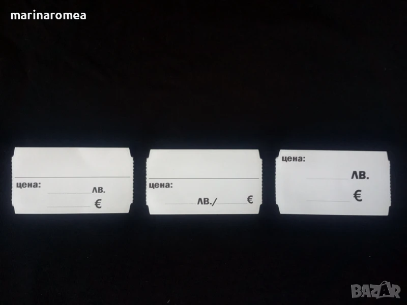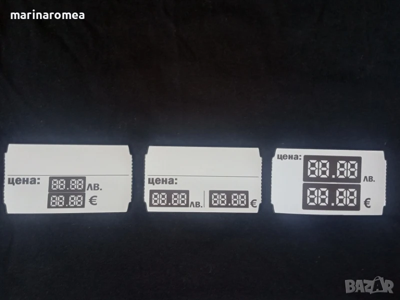 Марина Ромеа ЕООД продава универсални картонени етикети за показване на цените едновременно в лева и евро на рафта в магазини, супермаркети и всякакви търговски обекти.