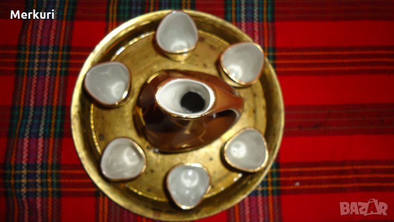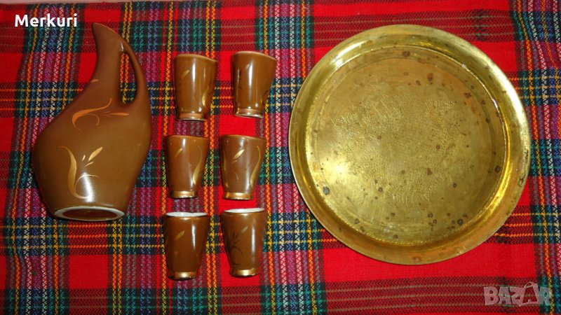 Продавам красив сервиз направен 80-те години от България.Сервизът включва елегантна бутилка , 6 броя чаши и месигов поднос, подходящ за сервиране на алкохолни напитки.