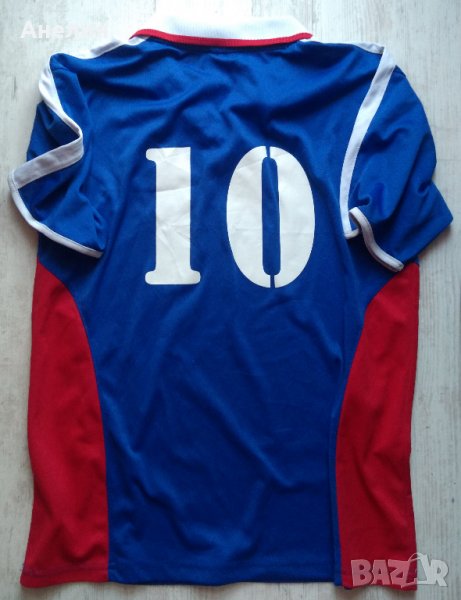Футболна фланелка на националния отбор на Франция. В отлично състояние. Лека, спортна материя .Размер S / ръст 152 см. Размери, измерени от мен: ширина - 50 см., дължина - 64 см. Изпращам с "Еконт" или "Спиди".