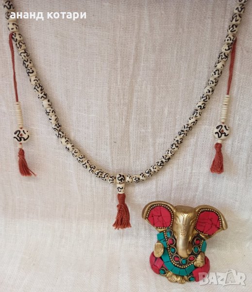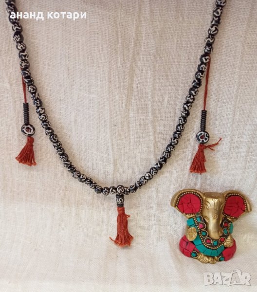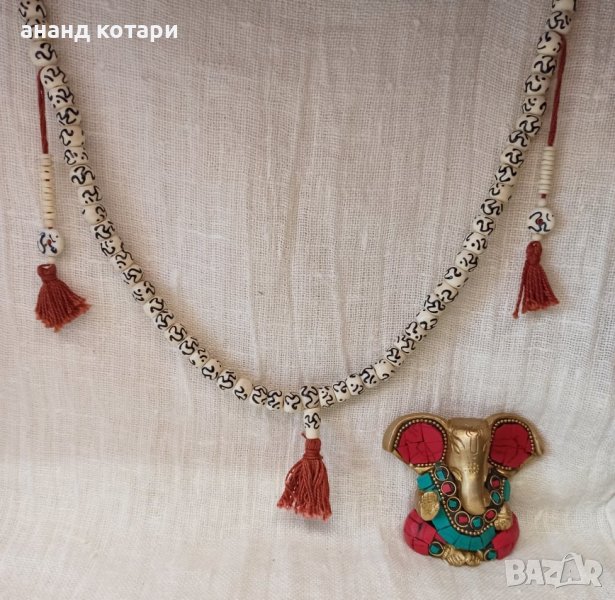 Тази привлекателна мала (броеница) за медитация разполага с миниатюрен символ Om на всяко от своите 108 боядисани костни мъниста. Числото 108 има духовно значение в няколко култури и се смята, че като брои 108 молитви или мантри, практикуващият се приближава към духовния център на Вселената. Едно отделно мънисто в горната част на малата показва началната точка за молитвата. Мънистата са с размери 7-8 мм.