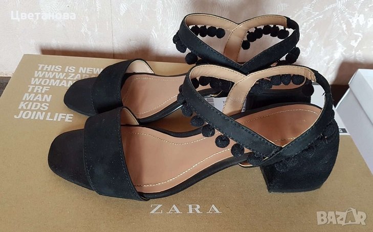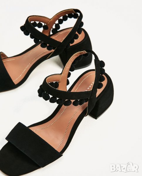 ЗАРА КОЖЕНИ САНДАЛИ СЪС СРЕДНО ВИСОК ТОК И ПОМПОНИ