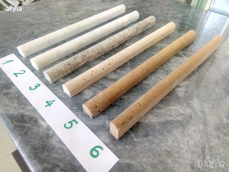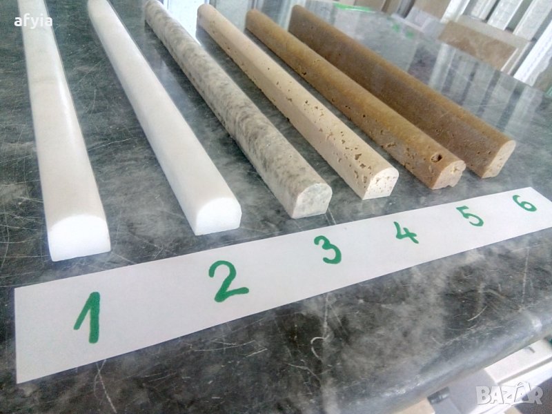 Изработени от различни видове мрамор и травертин. Служат за завършване на плот към стена. Лесен монтаж, при направа на ъгли се режат под 45 градуса на герунг. Естествени по-светли и по-тъмни нишки и петна. Всички с еднаква дължина 30,5 см. Размерите на сечението са показани в описанието.