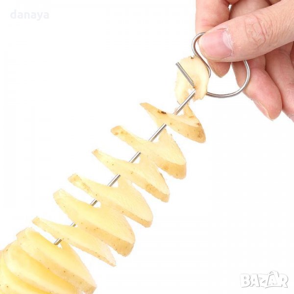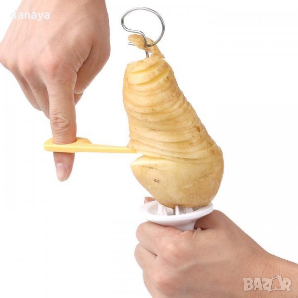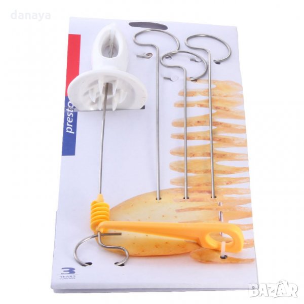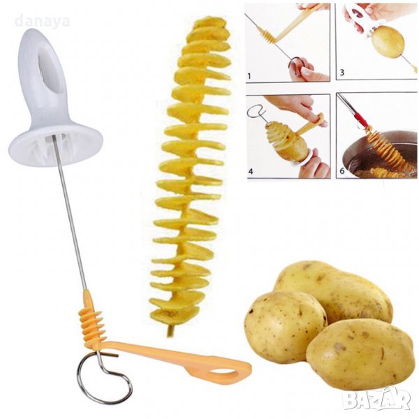 картофи, краставица или други зеленчуци. Прибор за картофен чипс на клечка. Спираловидният нож за картофи и стабилната дръжка са изработени от устойчива пластмаса.