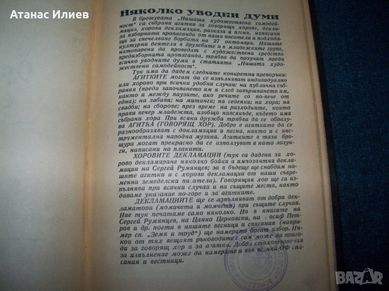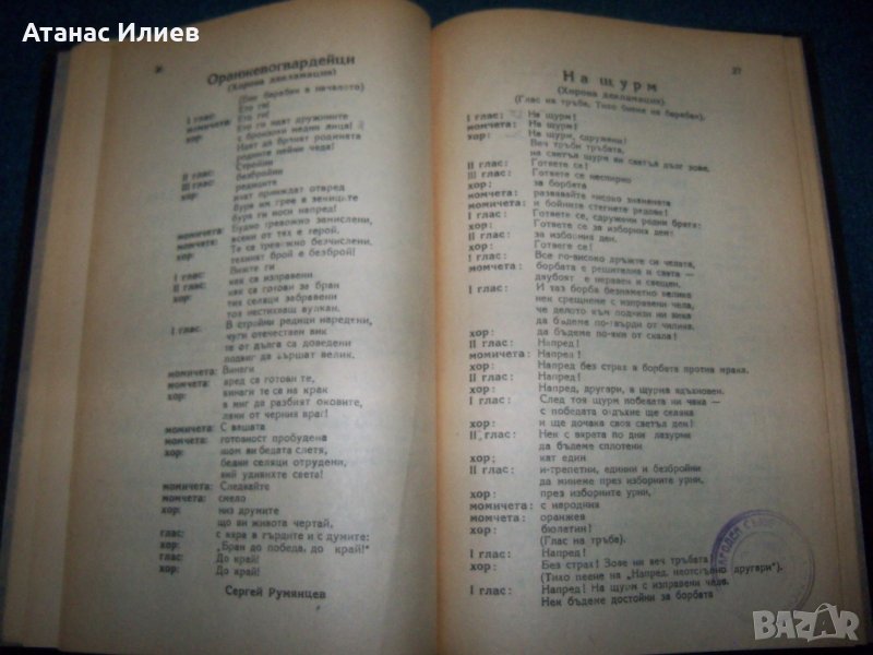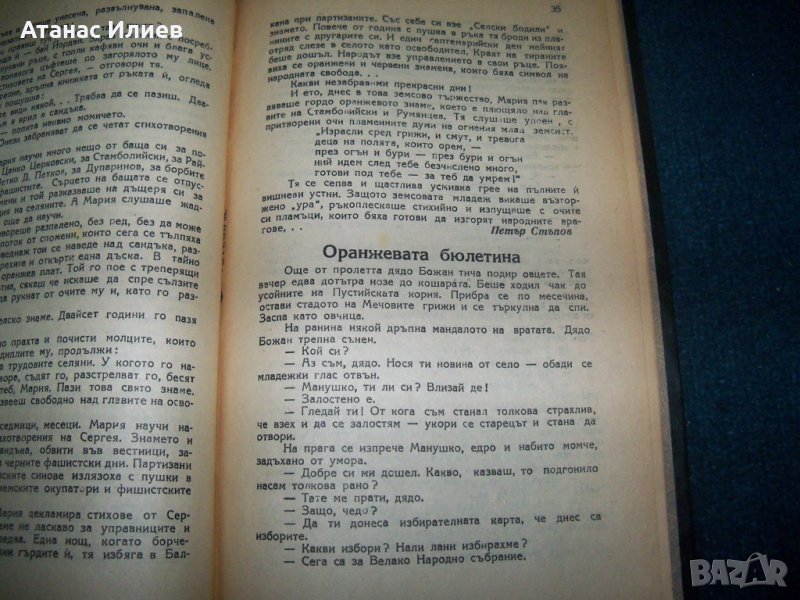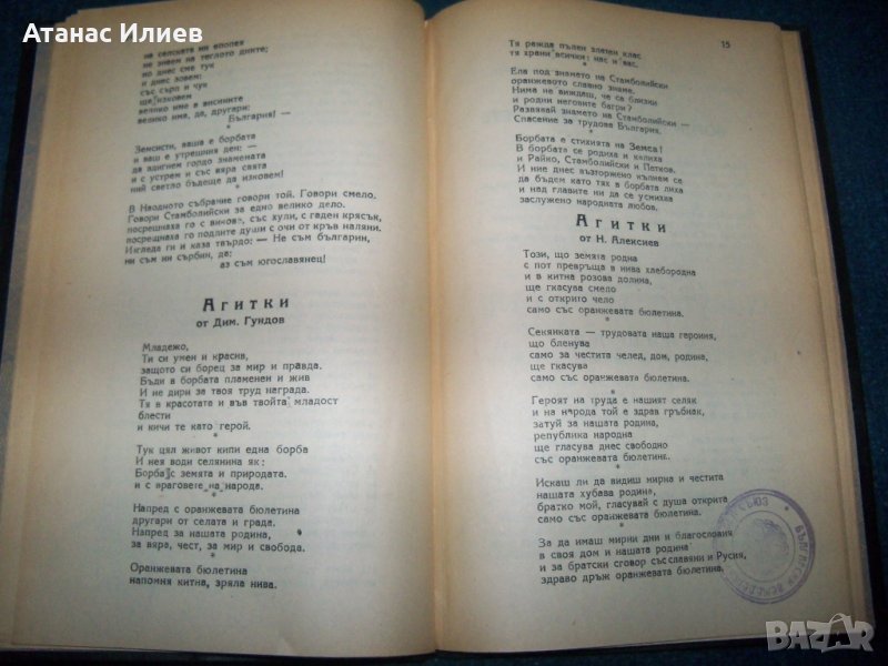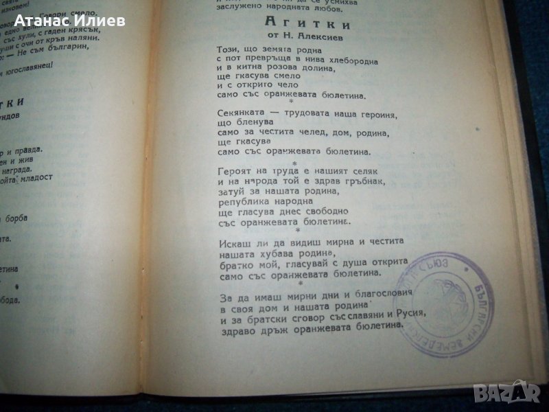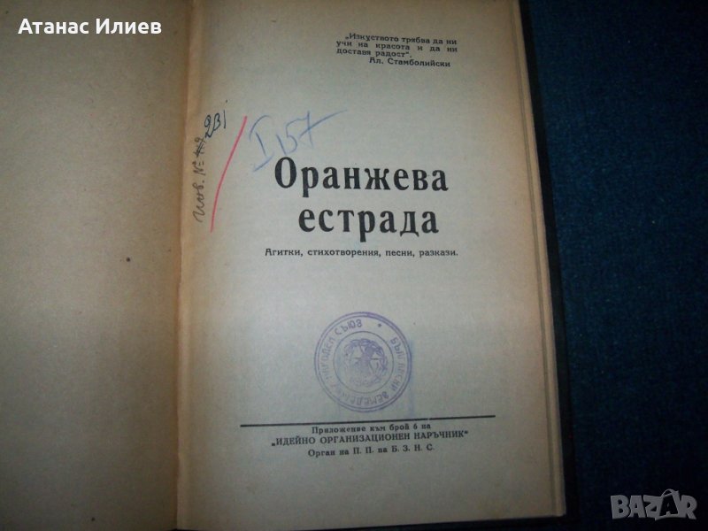 Изключително интересна книга "Оранжева естрада - агитки, стихотворения, песни, разкази". Книгата е предназначена за предизборна агитация на БЗНС за изборите през 1946г. Всички творби включени в нея са специално написани за изборите с цел повдигане на духа и апел за активно участие и подкрепа от страна на гласоподавателите. Книгата е подвързана с твърди корици, 40 стр. в отлично състояние. Книгата е издадена през 1946г. от БЗНС.