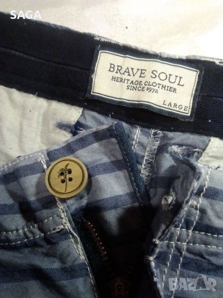 Дънките са на BRAVE SOUL, оригинални, със сериен номер, супер интересни. Обувани са веднъж, без забележки, като нови, по номер са L. Материята е 100% памук, изработени са от тънък плат деним. Цвета е като на снимките, преливащо синьо. Закопчават се с цип и копче. Отпред са с два джоба, отзад също. Има лого на копчетата.Талия-46/47см. дължина-51см. крачол долу-26см.