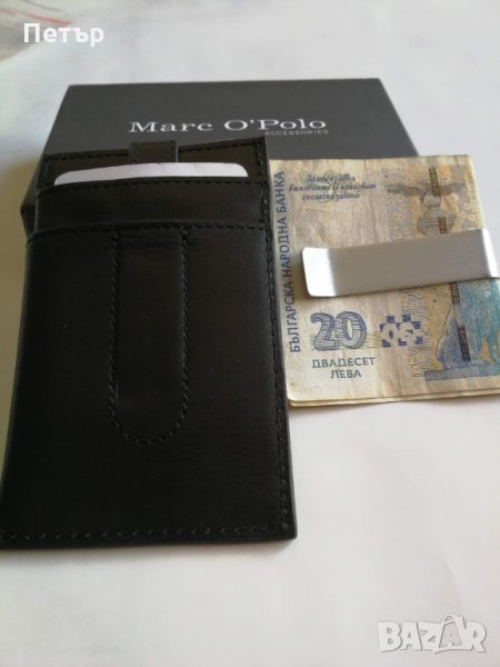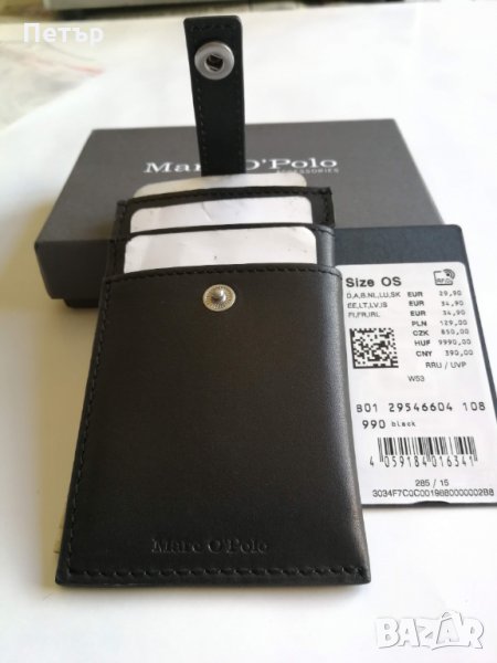 Чисто нов картодържач с етикета. Вертикален тип и е изработен от черна естествена кожа. Оригинален е на фирмата Marc O'Polo, а модела е W53 Copenhagen. Има поставен материал за RFID защита предпазващ вашите данни от кражба.
