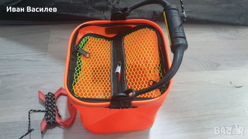 Страхотна мека кофа с въже 6 метра за живи рибки ,жива стръв ,дори за живарник ,можете да си охлаждате и бирата вътре!Здрава дръжка!Ципове от горе за удобно отваряне от всички посоки!Мрежа за да диша и да гледате вътре!Лесно се носи,не тежи сгъвате я и в раницата!Размерите са около 25см куб!