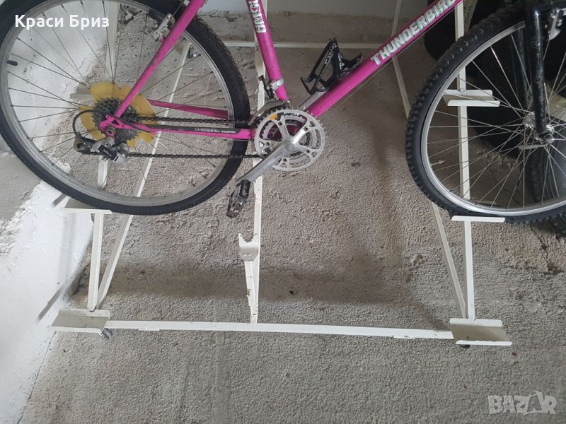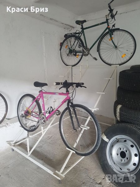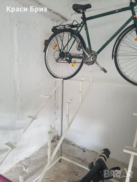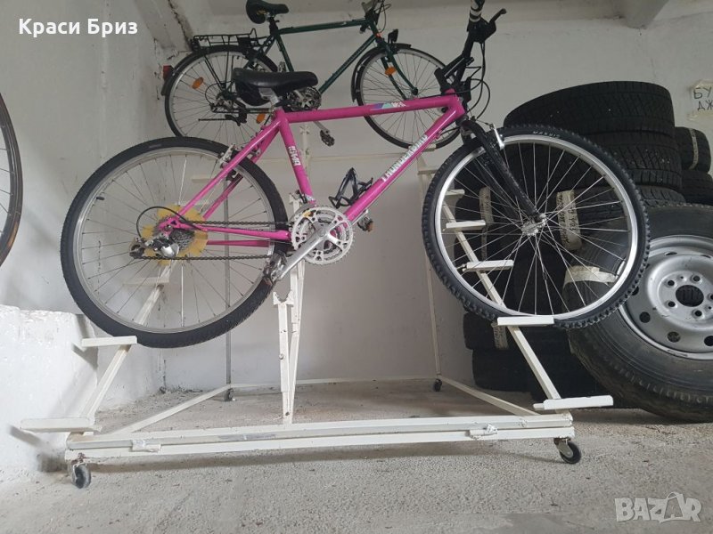 Метални стелажи за 7 броя велосипеди, подходящи за излагане и продажба на колелета. Стават за всички видове велосипеди, регулират се според цолажа на колелото. Налични четири броя на колелца, и четири броя стационарни. Обявената цена е за един брой стелаж.