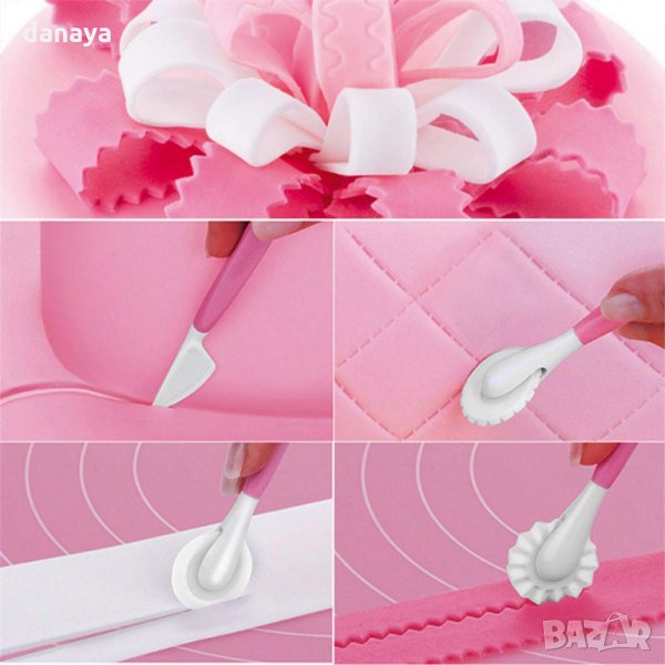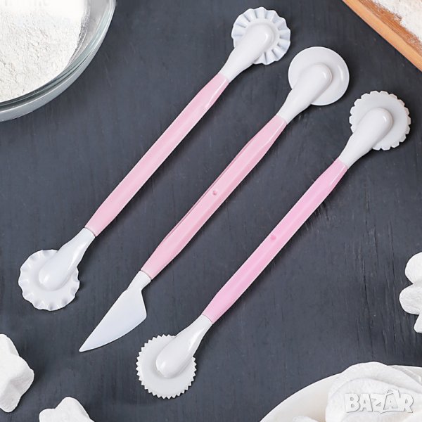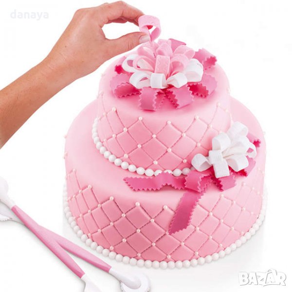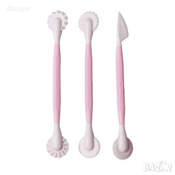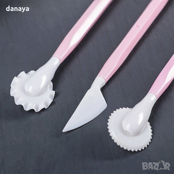 Нож за фондан, изрязване на захарно тесто. Комплект от 3 броя двустранни сладкарски инструменти за рязане на захарно тесто, шоколад, фондан. Резци за декорация на торти и други сладкиши. Всеки инструмент има по два различни накрайника, което прави общо 6 накрайника за моделиране на различни фигури. Лесна изработка на панделки, прави, къдрави ленти и всякакви други декорации.