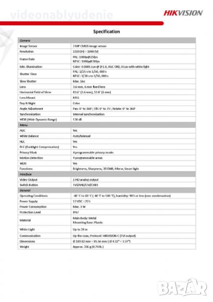 Камера: 2 MPX CMOS сензор, 25 кадъра в секунда, 3D-DNR шумов филтър, White Balance: автоматичен/ръчен, Gain Control: Low/Middle/High, Auto Electronic Shutter: 1/25 ~ 1/50 000 s, 1 HD BNC видео изход.
