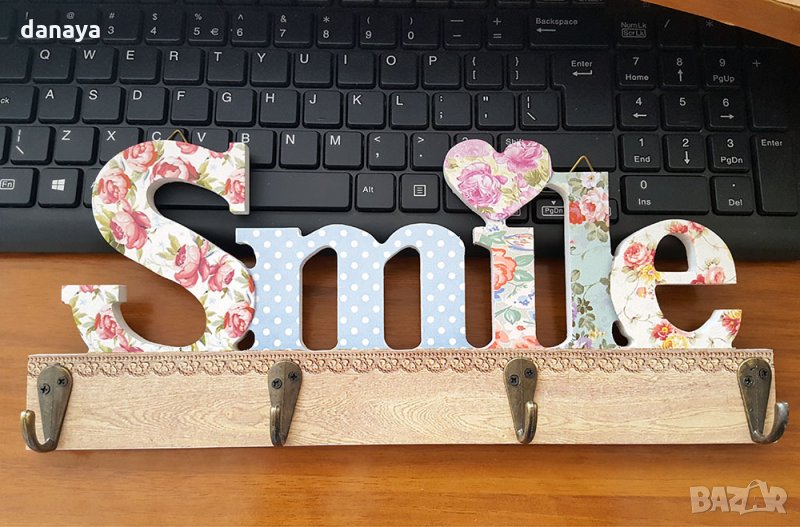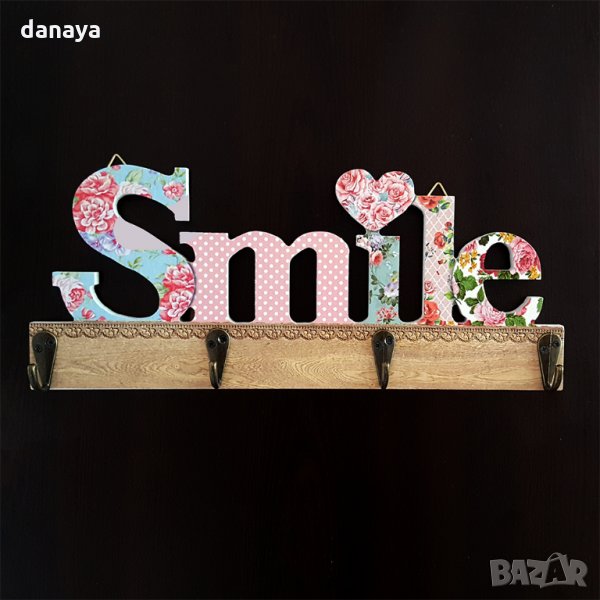 Декоративна закачалка за стена с надпис Smile и красив флорален принт. Закачалката има 4 куки за закачане на дрехи и други аксесоари. Чудесна декорация за стена. Закачалката е подходяща, като закачалка за ключове и като закачалка за дрехи. Стабилна основа. В задната й част има две куки за закачане. Предлага се в два варианта.