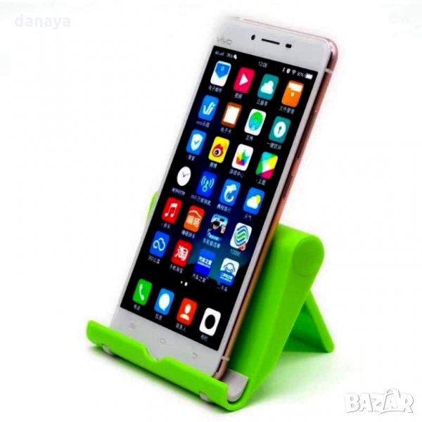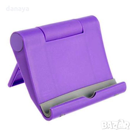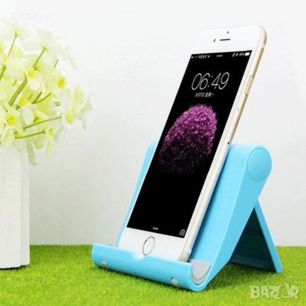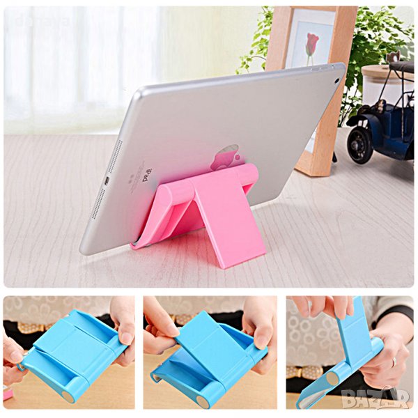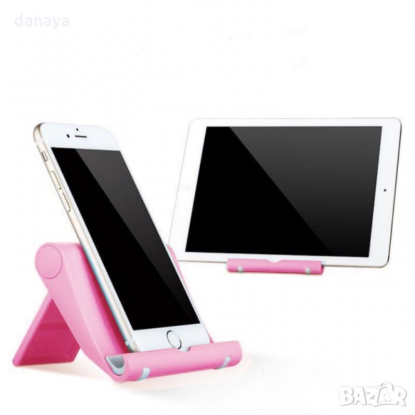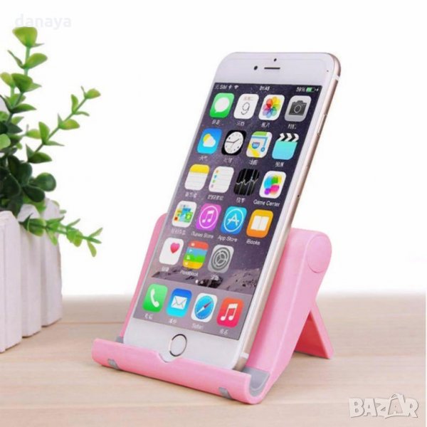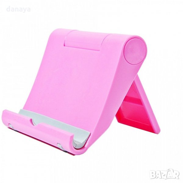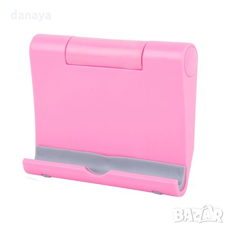 Универсална сгъваема стойка за телефон за бюро или маса с регулируем ъгъл на наклона. Универсална поставка за мобилни телефони съвместима с всички смартфони и таблети от 4 до 10 инча. Гумена подложка за предпазване на устройството от надраскване. Гумени крачета, осигуряващи стабилност на стойката. Предлага се в розов и бял цвят.