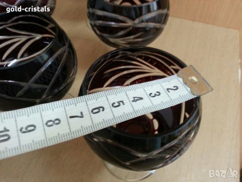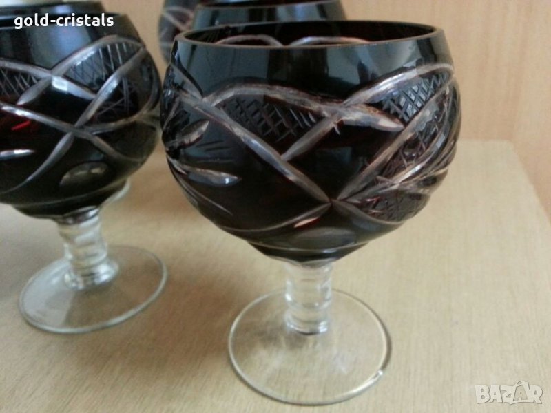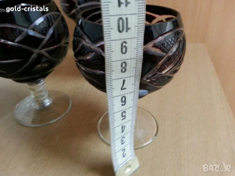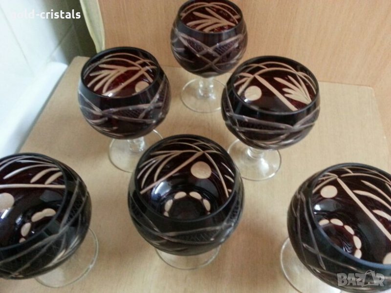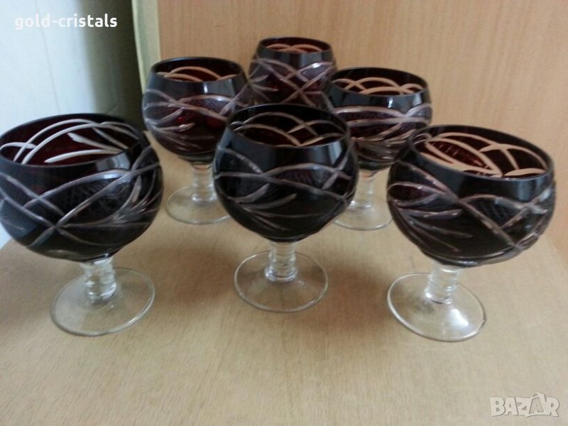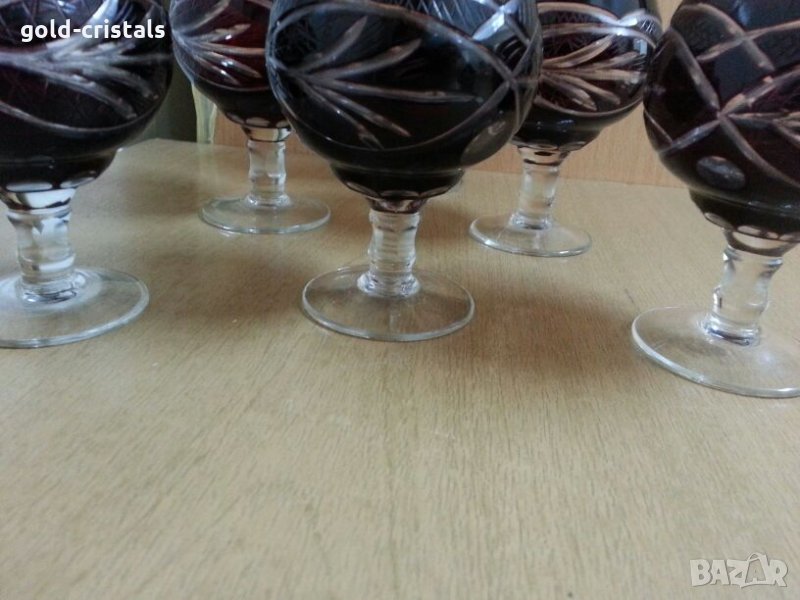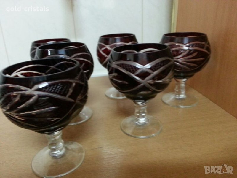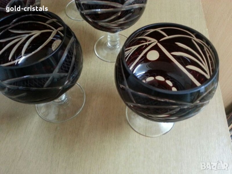 Кристални чаши цветен червен кристал ръчно гравирани ръчна изработка кристално стъкло цветно стъкло сервиз комплект сет лот ретро арт декор винтидж колекция стари старинни антикварни предмети обзавеждане за дома и семейството подходящи за подарък за ценители и колекционери руски кристал съветски ссср