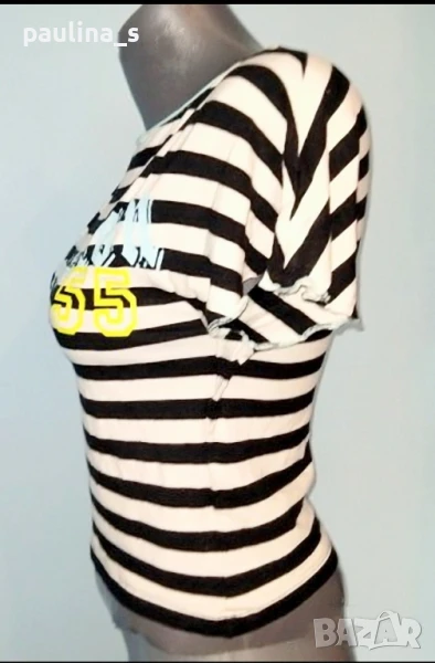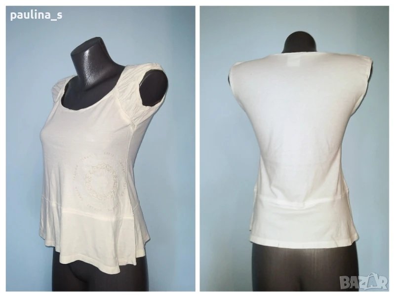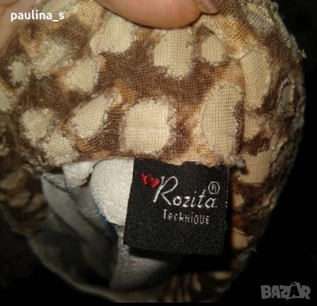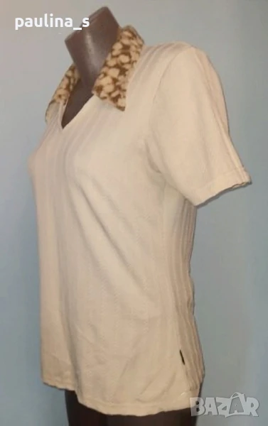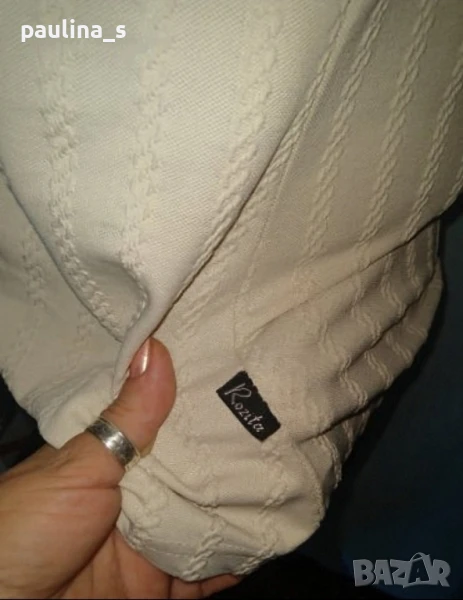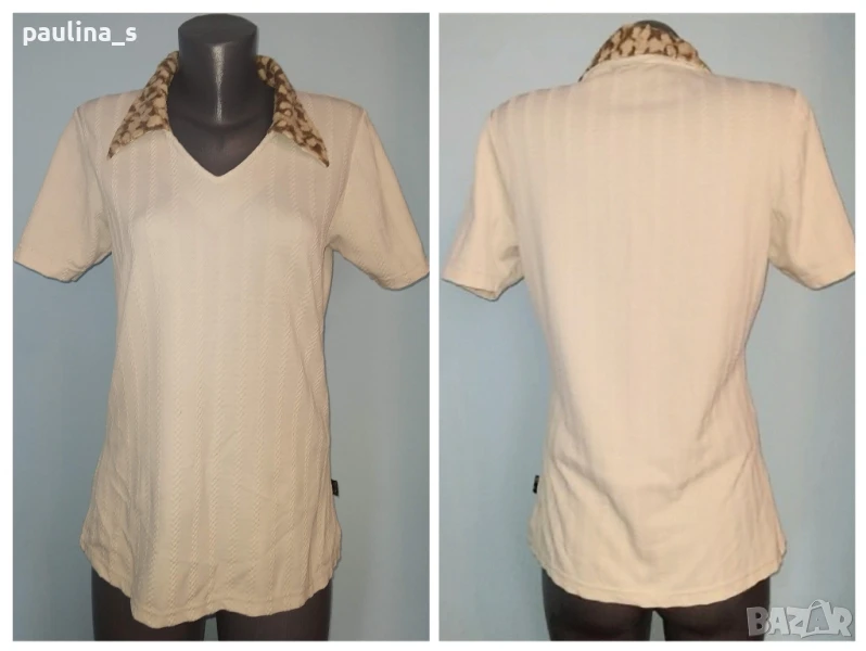 4️⃣. M / 2XL - "Rozita". Цената е крайна 14,99лв. Еластична блуза с контрастна яка, V - образно деколте, къси ръкави. Трикото е релефна ликра, плътно и много еластично, покрива няколко размера. Не е нова, но е без дефекти.