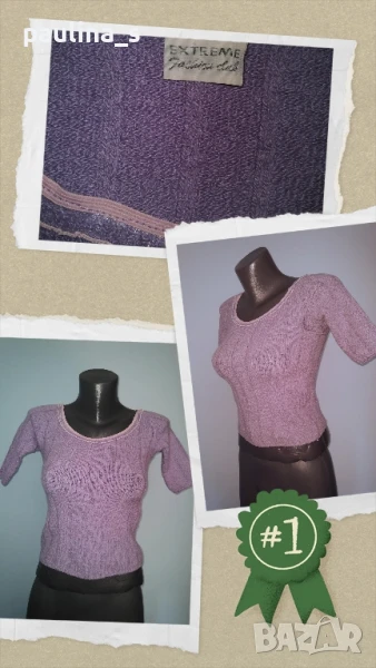 1️⃣. Колаж / S / 3XL - "Extreme" fashion club. Цената е крайна 24,99лв. Хипереластична дизайнерска лилава блуза като на заглавната снимка. Материята е хипереластична и покрива няколко номера, без да засяга и дължината. Приятна е за допир и носене, бието е завършено с дискретен рюш, може да се носи и с открити рамене!