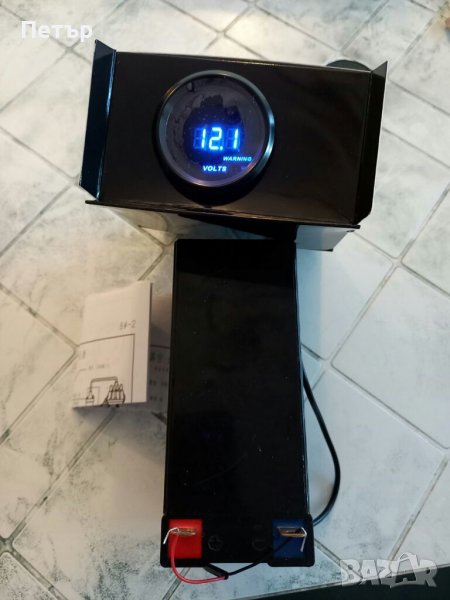 Дигитален волтметър, мери в диапазон от 8 до 20 волта, а уорнингът (warning) се активира под 10 волта. Връзва се към контактен плюс. Диаметъра на показващия уред е 52мм. С възможност за монтаж на стойка.