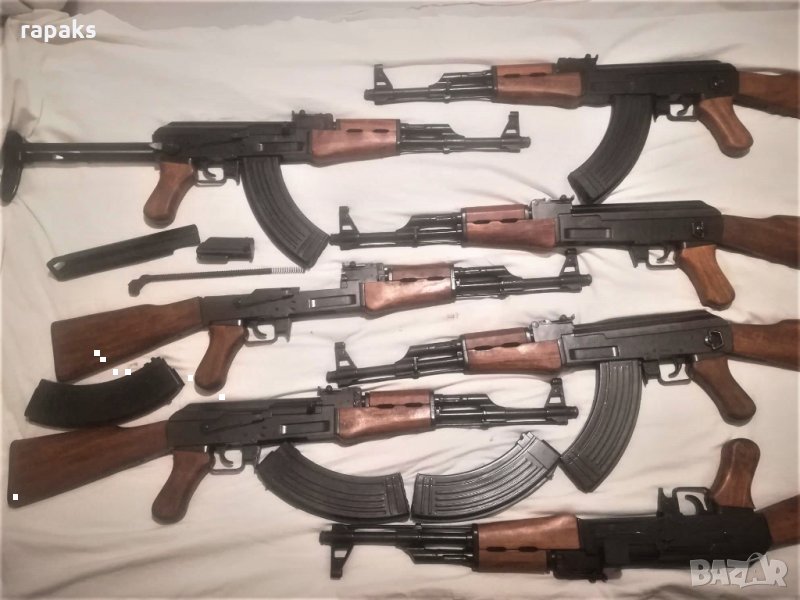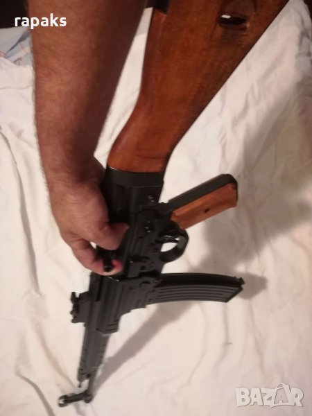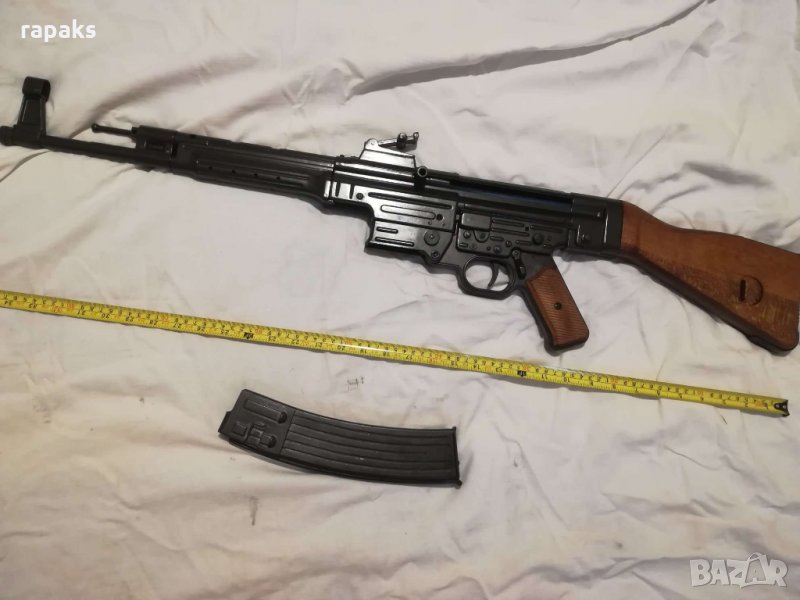 Реплика на немски автомат STG от 1943 г , 9 мм. Шмайзер МР 44 е дълъг 93 см и тежи 4700 гр.. Масивен и точно копие на истинският. Изработен е от метал и дърво. Зарежда, щрака и му се сваля пълнителя. Не може да гърми с нищо и за това е на свободна продажба, ако имате разрешението на тъща и съпруга. Не мога да продавам под себестойността и на глупави и обиждащи мен и артикула предложения отговарям по желание и с тон по мое лично усмотрение. Снимките след герба на Р. България само подсказват, че подавам още много варианти реплики на оръжия, патриотични дърворезби и страхотни идеи за подаръци на пораснали момчета и любими мъже.