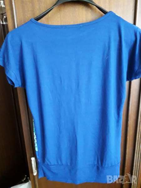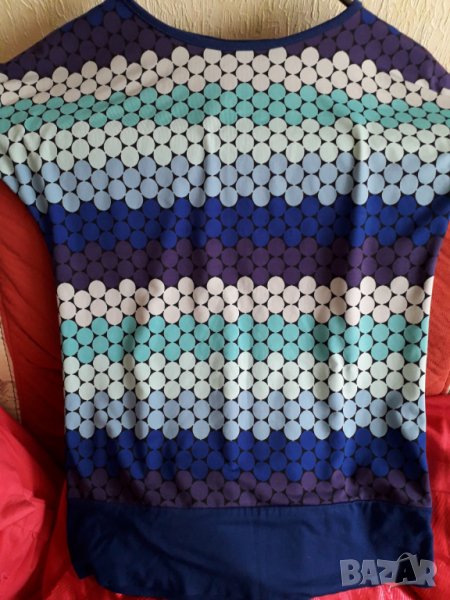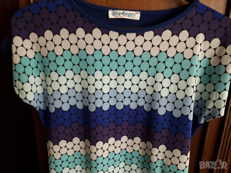 Дамска блуза с шарени точки, много хубава еластична материя. Обличана еднократно, като нова. Размер 42-44 българска номерация, бюст 42 /или обиколка 84, но има еластичност/, дължина 60 см. Отговарям на съобщения тук, изпращам с куриер с отстъпка, преглед и тест, или лично предаване в София.