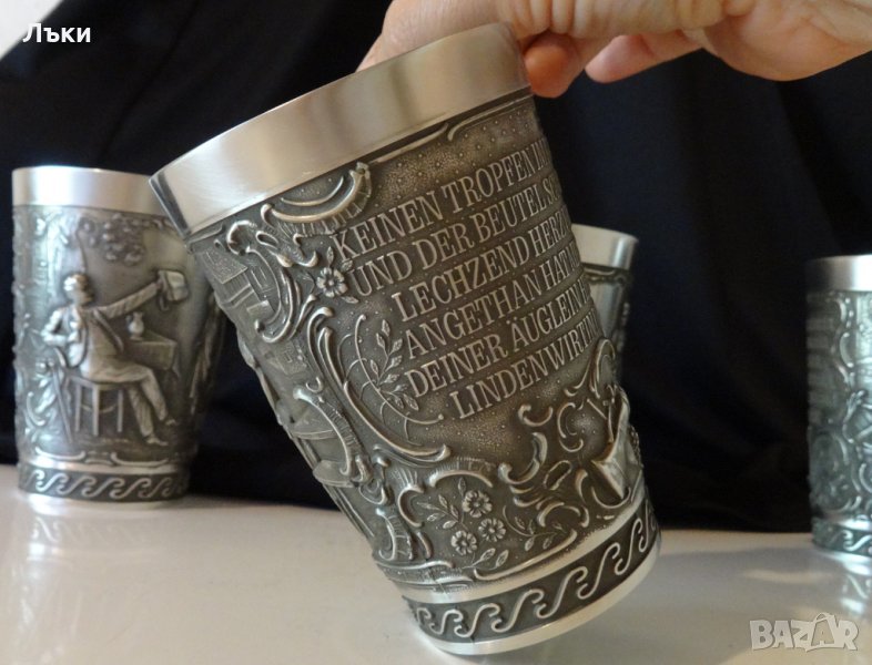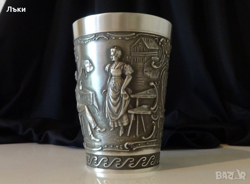 изработка от 95% калай и 5% сребро,маркирана.Има гравирана релефна сцена с мъж, седнал на маса с кана,вдигнал чанта в ръка и дама,на която говори.Гравиран надпис