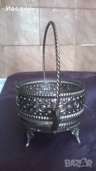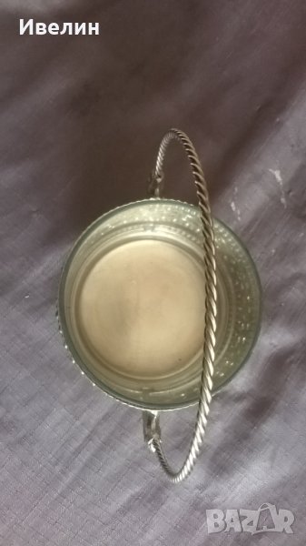 купа,бонбониера арт деко,стъклено тяло в метален обков.висока е 18см/с дръжката/,купичката е 9см/9,5см