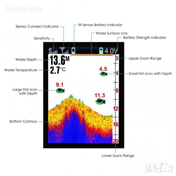 - Настройка на горна граница на дълбочина (функция за мащабиране): Изкл. / 1-45 метра регулируема дълбочина