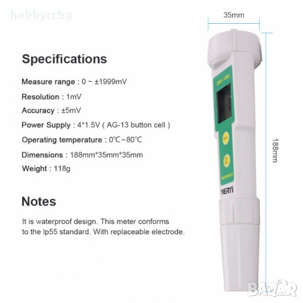 Измерва окислително-редукционния потенциал на вода и водни разтвори (ORP) в диапазон -1999 до + 1999 mV на стъпка от 1 mV. Има широка гама от приложения - от домакински до лабораторни и промишлени изследвания (тест за питейна вода, аквариуми, изкуствени резервоари, отпадни води), плувни басейни, системи за пречистване на вода, акведукти, СПА и др.