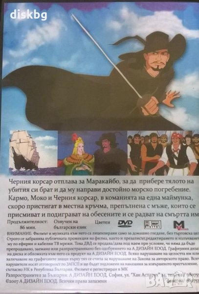 Детски анимационен филм на DVD "Черния корсар" в DVD кутия. Цветен. Дублиран на български език. Времетраене: 86 мин. Изпращам по куриер с опция преглед и тест. Лично предаване от нашия магазин "PCtop.BG", намиращ се в гр. София, Студентски град, ул. Университетски парк № 7. Подробности за местоположение, работно време и други наши артикули на "DiskBG.com".
