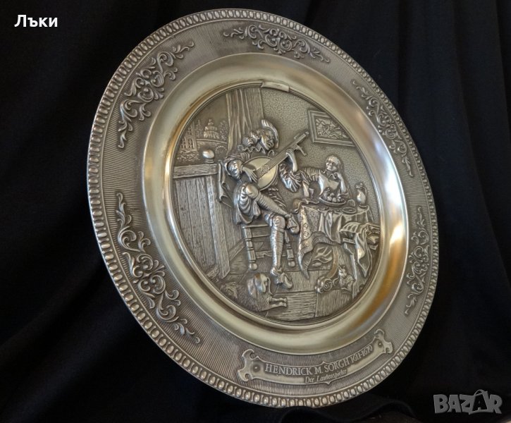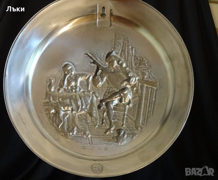 Martenzoon Sorg,творил през 17 век в епохата на бароковия стил.По края чинията е релефно декорирана с барокови орнаменти.Диаметър 26 см.,височина 1.8 см.,тегло 570 гр.