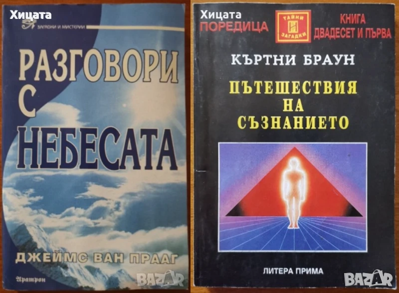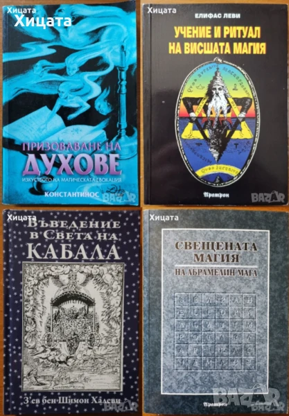 Призоваване на духове.Изкуството на магическата евокация,Константинос,Иратрон,2001г.302стр. - 150лв.Пътешествия на съзнанието,Къртни Браун,Литера Прима,1996г.224стр. - 80лв. Разговори с небесата.Посланията на един медиум за живота след смъртта,Джеймс ван Прааг,Аратрон,1999г.256стр. - 70лв. Учение и ритуал на висшата магия, Елифас Леви, Аратрон,2000г.368стр.Отлична с подчертан с молив текст на места! - 60лв. Въведение в света на