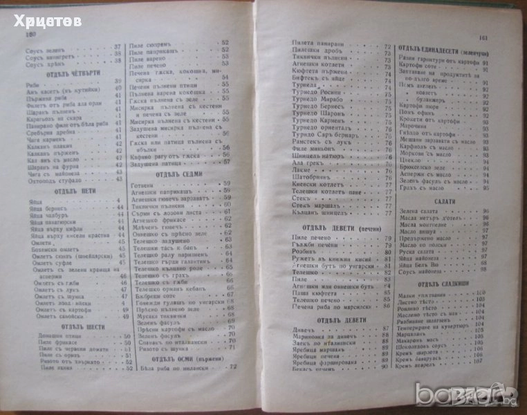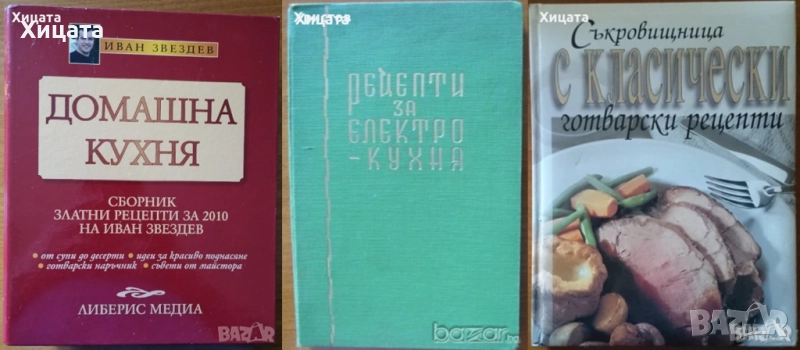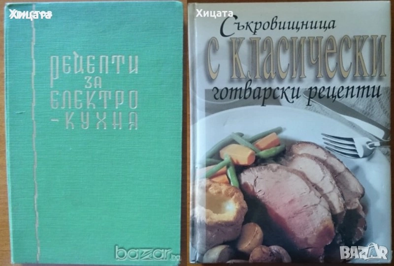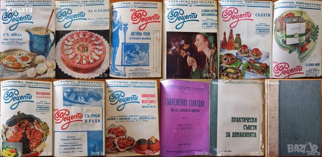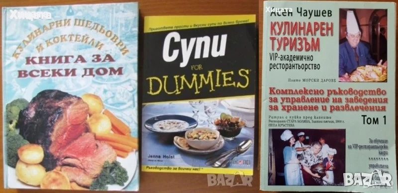 Джена Холст,AlexSoft,2005г. - 50лв. Кулинарни шедьоври и коктейли. Книга за всеки дом,Елит прес,2000г.399стр.- 120лв. Кулинарен туризъм.Том 1,Асен Чаушев,Интерменю,2006г.512стр.Отлична! - 80лв. Подвързани заедно 12 книжки: Готварска библиотека,Приложения на списание "Икономия и Домакинство"Теодора Пейкова Книжка 1: Над 50 рецепти с яйца,Теодора Пейкова,1929г.32стр.; Книжка 3:Над 50 рецепти за сладки,Теодора Пейкова,1929г.32стр.;Книжка 4: Над 50 рецепти за ликьори, коктейли, болета, лимонади и др.Теодора Пейкова,1932г.32стр; Книжка 5: Над 50 рецепти за използване на остатъци от варено месо, риба и др.Теодора Пейкова,1929г.32стр.;Книжка 6:Над 50 рецепти САЛАТИ,Теодора Пейкова,1932г.32стр.;Книжка 7:Над 50 рецепти с дървено масло,Теодора Пейкова,1932г.24стр.;Книжка 8:Над 50 рецепти Вегетариански яденета,Теодора Пейкова,1932г.24стр.;Книжка 9:Над 50 рецепти с риба и раци,Теодора Пейкова,1929г.32стр.;Книжка 10:Над 50 рецепти. Диетична кухня (за отслабване и напъляване),Теодора Пейкова,1932г.16стр.;Сто отбрани рецепти на ястия и сладкиши съ оризъ,А Ескофие ,1934г.40стр.Практически съвети за домакинята,библиотека"Модерна домакиня",1932г.56стр.;Съвременна етикеция.Как да се държим в обществото.Част 1,Превел и наредил Б.Георгиев,1932г.176стр. Цената е за всичките 12 книжки подвързани заедно! - 480лв Вкусно - рецептите на Ути,Ути Бъчваров,Акваграфикс ООД,1998г.240стр. - 25лв. Американска кухня,Антония Смилова, Георги Горов,Ананда,1993г.240стр. - 25лв. Сладкарски аромати,Славчо Петров, сладкар на Цар Борис III,Айси,1996г.96стр. - 25лв.Кухнята на Близкия изток,Йорданка Пътова,Прозорец,1992г.160стр. - 25лв.Стокознание,Христо Кожухаров,УИ "Стопанство",2001г.588стр. - 40лв.Справочник на стоковеда по хранително-вкусови стоки,А.Андреев,А.Георгиев,П.Братованова,Х.Дончев,Х.Кьосев,Изд.Георги Бакалов,1984г.420стр.Отлична! - 40лв Стокознание на хранително-вкусовите стоки,Андрей К. Андреев, Христо Дончев,Георги Бакалов,1987г.520стр. - 30лв.Стратегическият избор в туризма,Изд.Тракия-М,2005г.502стр. - 40лв.