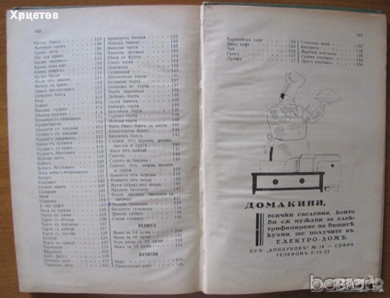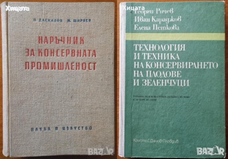 Технология и техника на консервирането на плодове и зеленчуци,Георги Ричев,Иван Караджов,Елена Петкова,1983г.312стр. - 140лв. Наръчник за консервната промишленост,П.Даскалов,М.Ширяев,Наука и изкуство,1956г.684стр. - 160лв. Домашна кухня. Част 1-2. Звездните рецепти на Иван Звездев 2010г. Над 350 рецепти в класьор - 95лв Рецепти за електро-кухня,Владо Иванов, Борис Пенев,изд.Електро-домъ 1939г.172стр.изключително състояние. - 120лв Съвременна кухня (3000 рецепти),Нацко Сотиров,Техника,1959г.672стр.Липсват 1-16стр. и 641-672стр.Несъществени страници.Основното,Рецептите са в книгата! - 70лв. Съвременна кухня.3000 рецепти,Нацко Сотиров,Техника,1959г.672стр. - 85лв. Съвременна кухня.3000 рецепти,Нацко Сотиров,Техника,1959г.672стр. - 95лв. Съвременна кухня (3000 рецепти),Нацко Сотиров,Техника,1959г.672стр.Преподвързана,Твърди корици,Изключително запазена! - 100лв. Съвременна кухня.3000 рецепти,Нацко Сотиров,Техника,1959г.672стр.Изключително запазена! - 110лв; Современная кухня.3000 рецептов,Нацко Сотиров,Техника,1963г.728стр.Изключително запазена!На руски език! - 120лв.Съкровищница с класически готварски рецепти,Джон Бътлър,Елит Прес,2001г.400стр. - 120лв Таблици за състава на българските хранителни продукти,Акад.Проф.Д-р Т.Ташев, Д-р.Г. Шишков,Медицина и Физкултура,1975г.352стр.Отлично състояние! - 180лв Български земеделски справочник,Ивелин Михайлов, Димитър Радулов,Издателство Сириус 4,2003г.620стр.Отлично състояние,Дарствен надпис и автограф от Проф.Радулов - 150лв