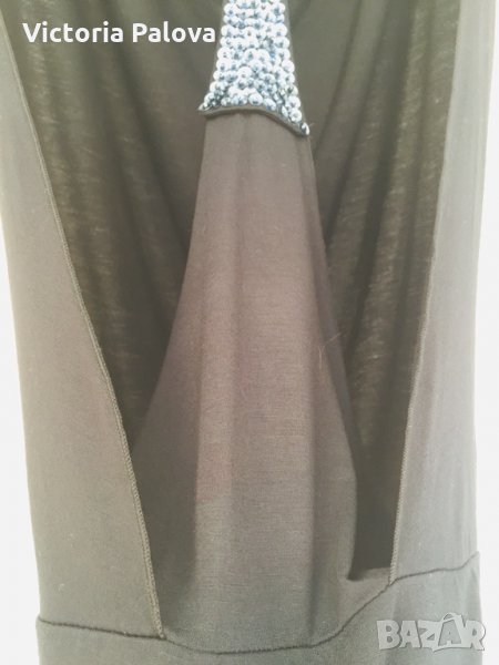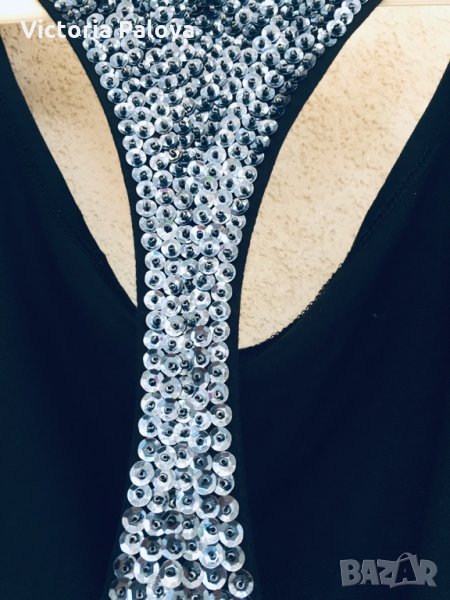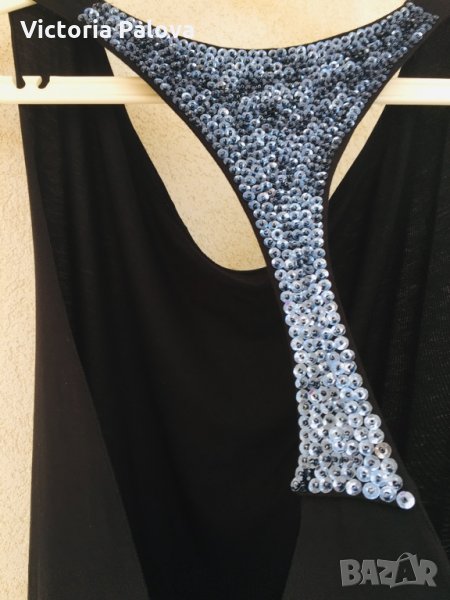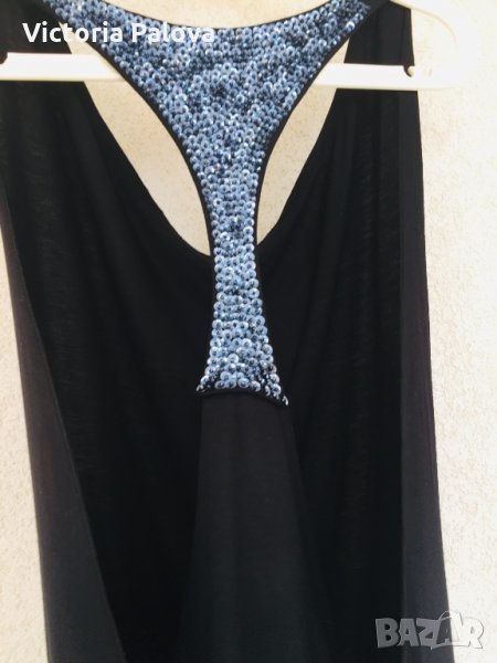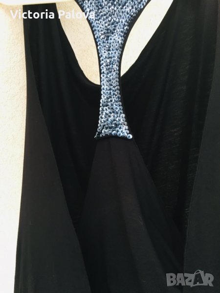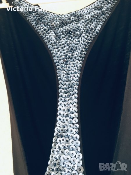 Неизползван нито веднъж,много ефектен,красив и впечатляващ.мека послушна материя,хубава кройка,незаменима дреха за морето(вечер),пайетите светят ненатрапчиво и много атрактивно,супер дреха.
