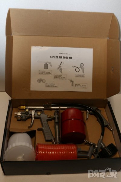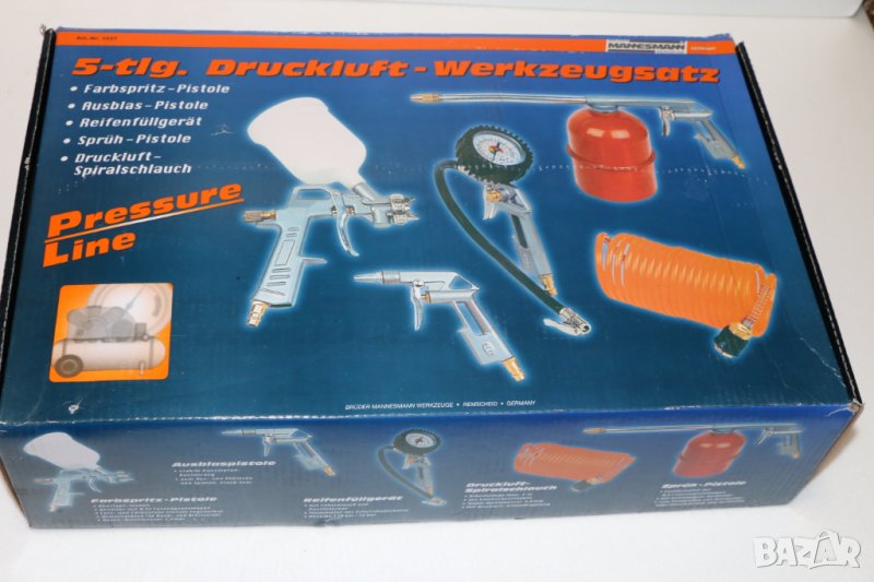 Комплект пневматични накрайници MANNESMANN 5 бр, нов, немски, внос от Германия. Пневматичен пистолет с манометър: 0-12бара; спирален маркуч- работна дължина до 4,5м, външен диаметър 8мм, вътрешен диаметър 6мм, въздушен пистолет - за изчистване на прах, и др.; пистолет за боядисване с горно казанче от 0.5л.: дюза - 1,5 мм; аерозолен пистолет; Тегло: 2,0кг.