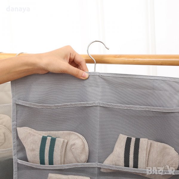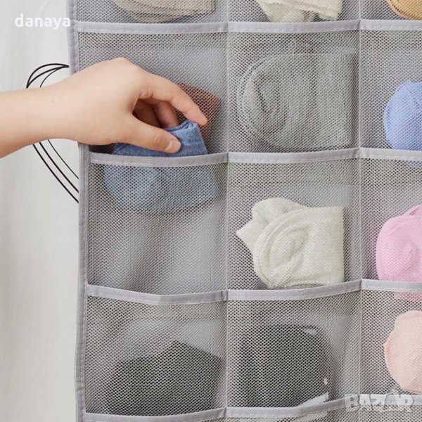 Текстилен органайзер за бельо, чорапи, сутиени и всякакви дребни аксесоари. Мултифункционален органайзер! Може да се използва и като органайзер за бижута. Органайзера е с две лица - предната част има 12 отделения, като едната колона е по-широка. Тя може да се използва за съхранение на сутиени. Задната част има 18 отделения, наистина побира много! Всички джобчета са мрежести за лесна видимост и проветрение. Органайзера има вградена закачалка, с която може да се закачи в гардероба или на друго място. Органайзерите се предлагат в два цвята - тъмно сив, светло бежев и светло сив.