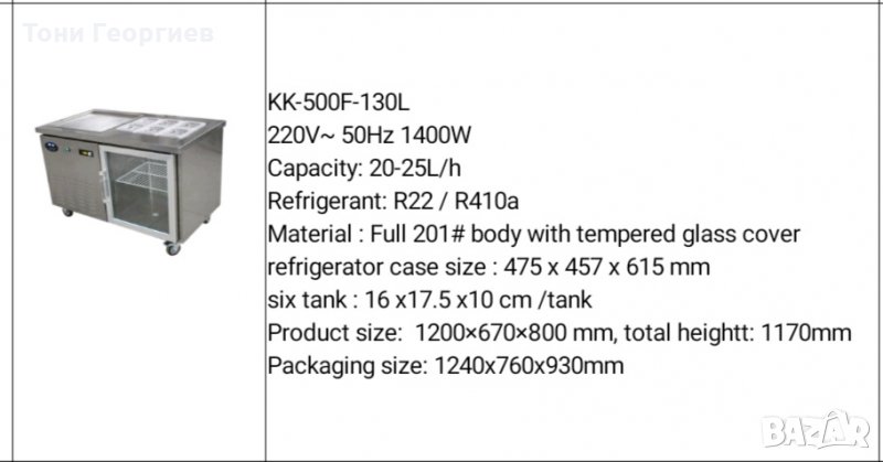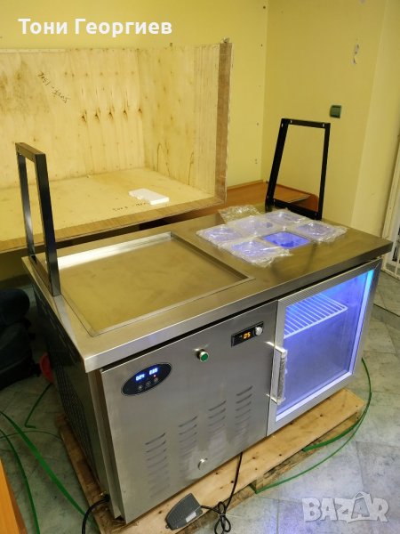 тайландски сладолед с една плоча, 6 бр. канти за поставяне на плодове и хладилно помещение. Машината е със страхотно атрактивно осветление, което ще привлече вниманието на вашите клиенти. Изглежда перфектно в тъмната част на денонощието. Ще е супер атрактивна за морето и по различните курорти.