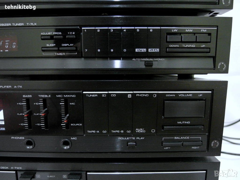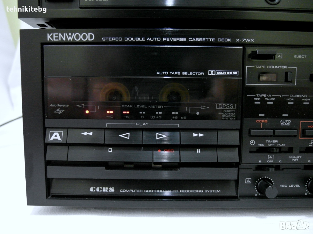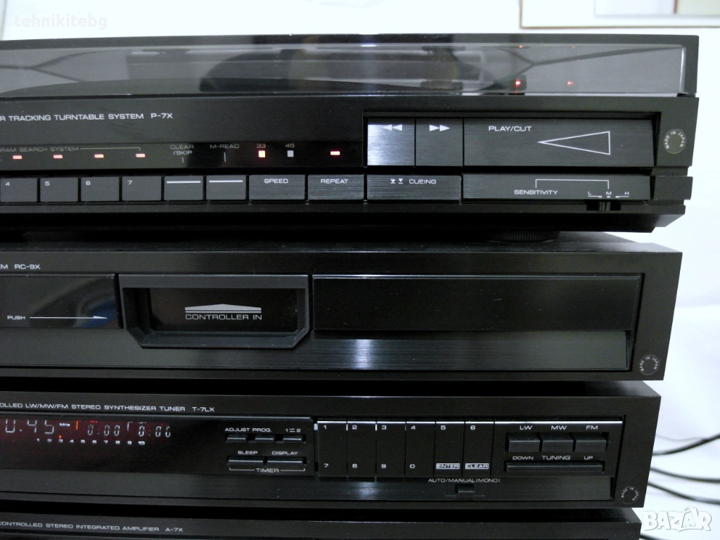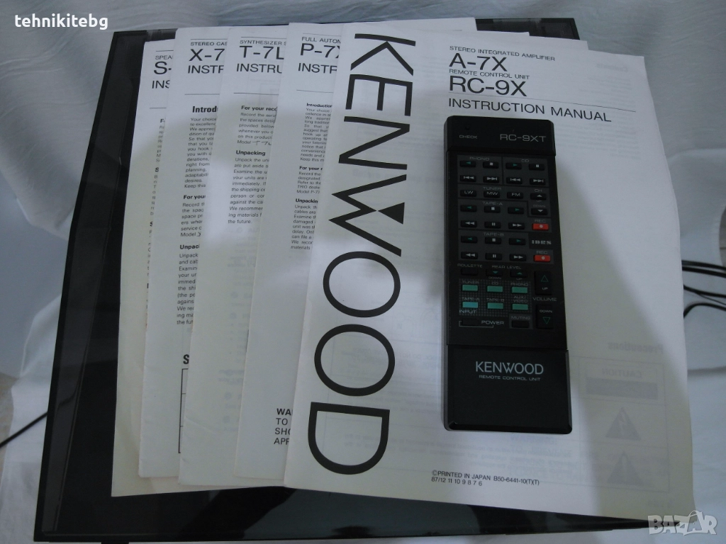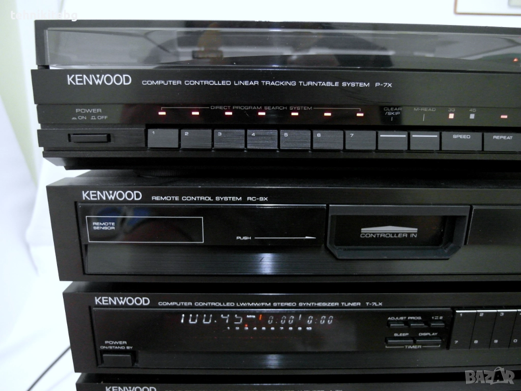 Рядко срещана компонентна ретро система от 1987 г. Миди формат 36 см. Състои се от усилвател , тунер , двукасетен дек , грамофон и приемник за дистанционното , с което се командват всички компоненти . Оригинално дистанционно и инструкции за всеки компонент , както и специален разклонител и кабели за свързването им . Усилвателят KENWOOD AX-7 е с мощност 2 х 60 вата на 8 ома и тегло 6.2 кг. Грамофонът KENWOOD P-7X е директ драйв с тегло 5.1 кг. Тунерът KENWOOD T-7LX е с 20 станции памет , има часовник с таймери и програми , функция приспиване , тегло 3.2 кг. Касетният дек KENWOOD X-7WX е аутореверсен , записва и на двете гнезда , има ауто биас , DPSS (Direct Program Search System) система за търсене и плейване на определена песен , IDRS (Isolated Dual Recording System) система , CCRS (Computer Controlled CD Recording System) система , Dolby NR , таймер за запис и прослушване , тегло 5.8 кг. Приемникът за дистанционното е KENWOOD RC-9X , с тегло 2.1 кг. Всички компоненти са прекрасно запазени за годините и външно са като нови . Произведени в Япония . Гнездо B на дека не тръгва , иска да се смени ремъка , гумата на платера на грамофона е нацепена , но не пречи на работата му . Цена с оригиналната ракла 385 евро. Поради теглото и размерите си , системата и раклата не може да бъдат изпратени по куриер . Лично внесени от Англия , закупени от първият им собственик - известен журналист от ББС Лондон (BBC).