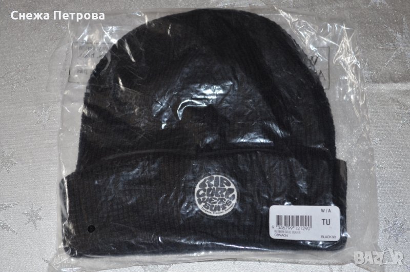 Шапката е чисто нова и с етикета. Оригинална е на Австралийската фирма Rip Curl, а модела e Rubber Soul Beanie. Характерното за модела е, че е изработена от два пласта плетен черен акрил, материята е изключително мека, издръжлива, топла и приятна на допир. Прешито лого отпред на шапката. Страна производител Китай. Размера на шапката по етикет е ONE SIZE или по данни на фирмата се равнява на 21-23.5 в in и 53-60 cm.