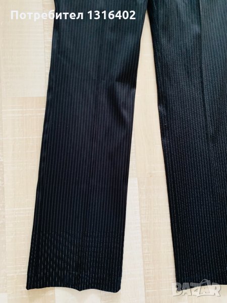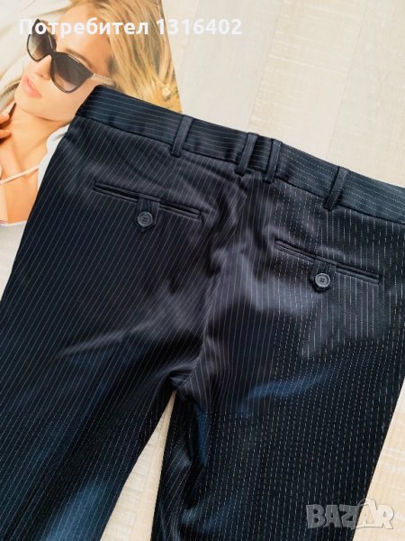 Стилен офис панталон с ръб, сатенирана материя, тъмно сим с финно бяло рае,марка “Mango”, размер М,eur 38, носен малко,без никакви забележки, талия 40см, ханш 48см,дължина 98см,ширина глезен 21см.