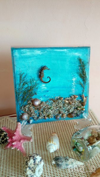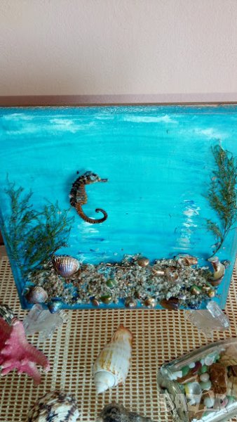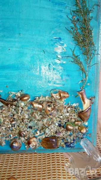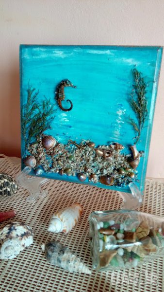Малко декоративно пано "Морско дъно" ,изработено с естествени декоративни елементи и морски пясък,вакс пасти и краен лак.16х16 см