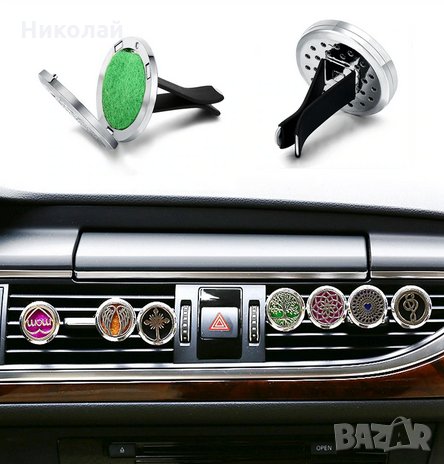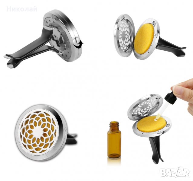 Метален ароматизатор за кола с етерични масла , изобразената форма на ароматизатора е цветето на живота . Отворете капачето и капнете няколко капки етерично масло и затворете , поставете го на въздуховодите.