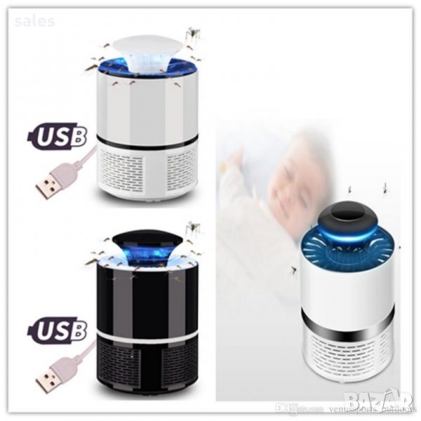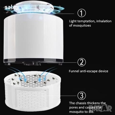 Този настолен уред за защита от комари е с красив дизайн, иновативна технология, с тих режим на работа, не отделя миризма и не излъчва вредни вещества. Свети с приятна, UV светлина. Светлината ще привлече комара, а вентилатора ще изсмуква комара бързо в кутията за събиране. Проектирана с USB порт, за свързване с лаптоп, компютър или пауър банк за захранване или включване в контакта с адаптера за зареждане на телефона. Изработен е от качествени материали и е подходящ за банки, ресторанти и други представителни места, поради своята дискретност. Ниска консумация на ток. Приблизителни размери: Височина - 18см Диаметър - 12см