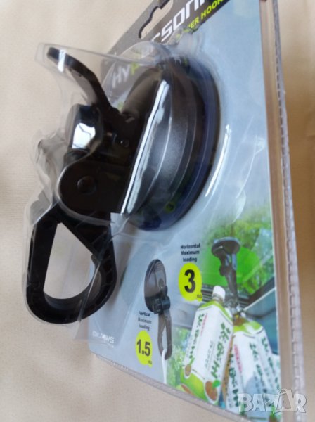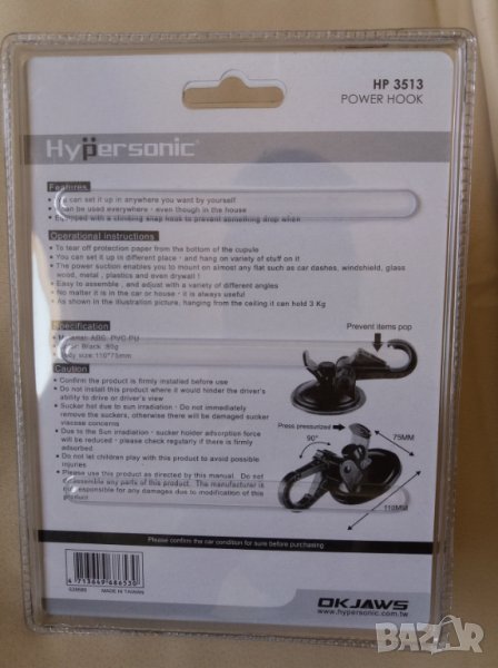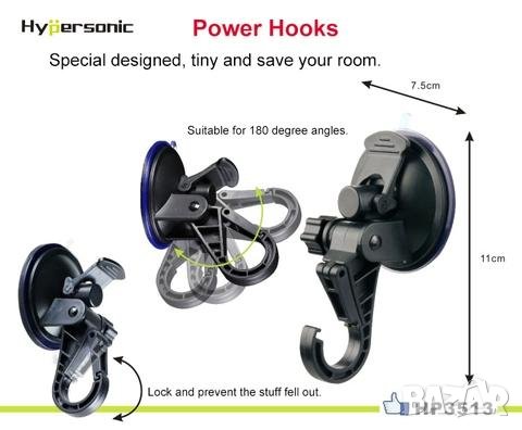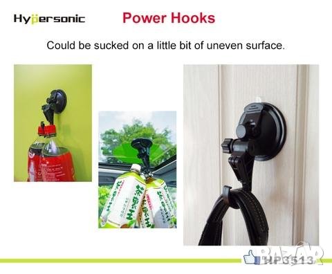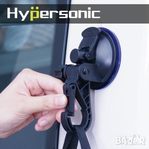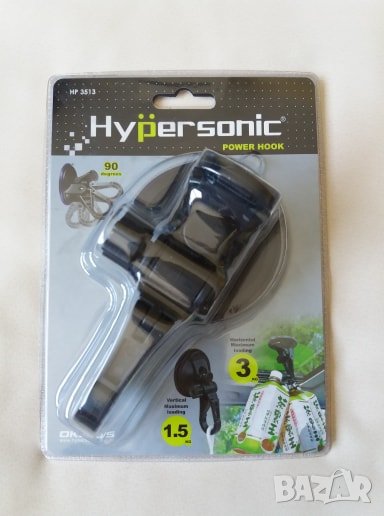 универсална закачалка с вакуум Hypersonic. Дължина 11 см, диаметър на вакуум механизма 75мм, наклон 90 градуса. Монтирана във вертикална поза издържа на тегло до 1,5 кг, в хоризонтално положение - до 3 кг. Практична, за използване в дома, за автомобил, каравана, къмпинг и др. Тегло 80 гр, цвят -черен.